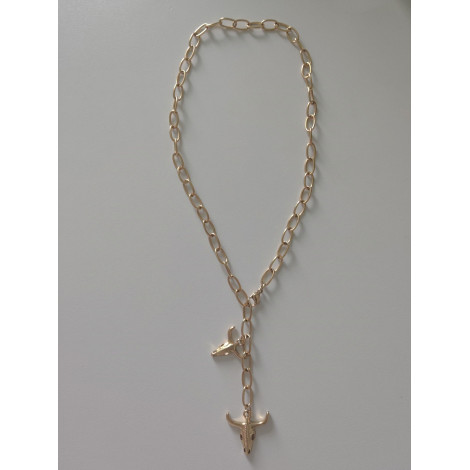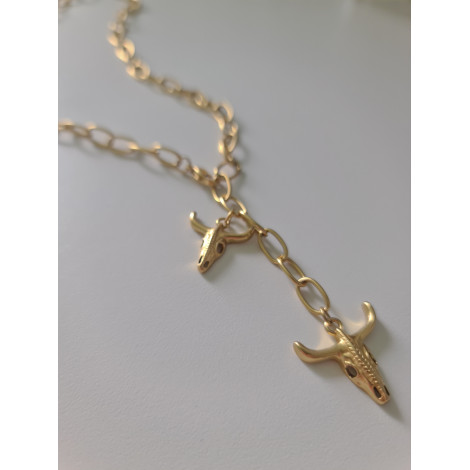 Collar de acero inoxidable de cadena con detalle de cráneo de búfalo. El largo total del collar es de 49.5 cm. Dorado.
