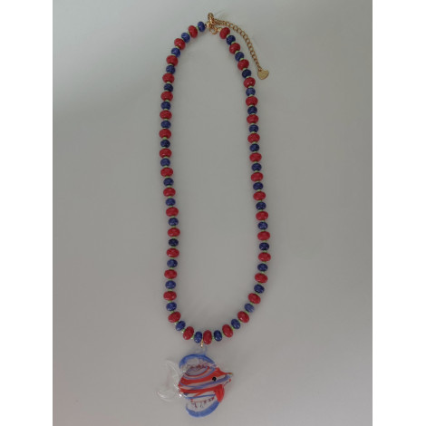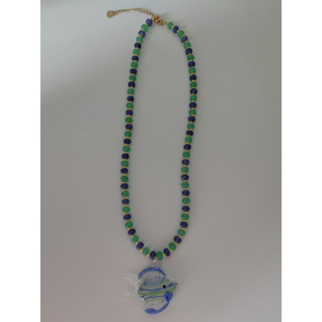 Collar hecho a mano con cuentas de piedra natural y pez de cristal soplado. Ajustable, con cierre de acero inoxidable.
